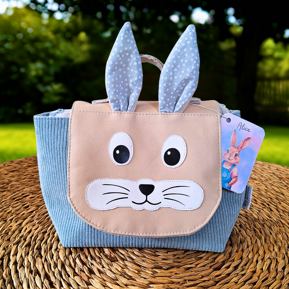 Trousse de toilette avec visage et oreilles d’animal, idéale pour ranger le nécessaire de toilette de bébé (peigne, ciseaux, lingettes etc…). Facilement transportable grâce à sa poignée.