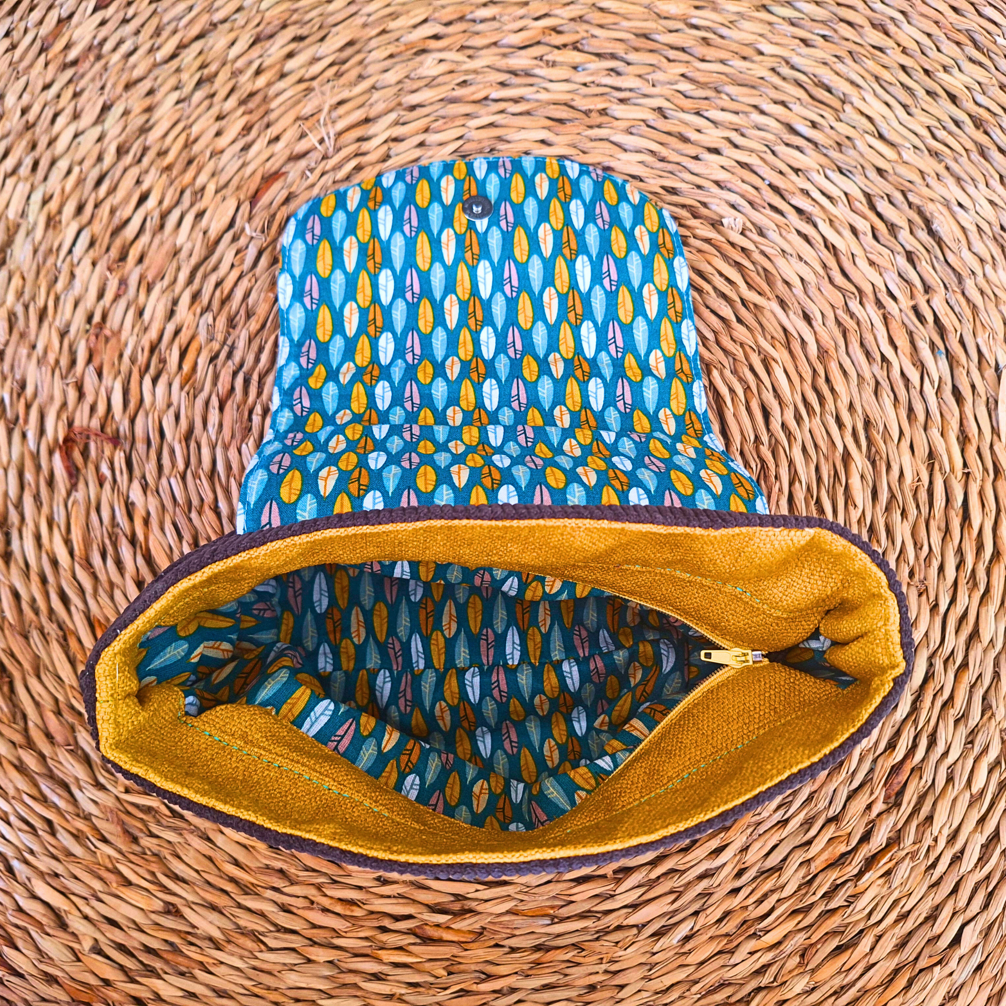 Fermeture avec un zip et un bouton magnétique sur le rabat.